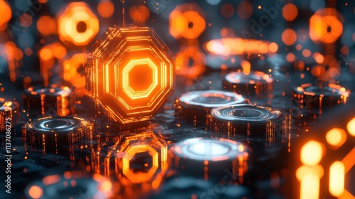 Futuristic Octagon Shape with Glowing Lines in Cyberspace