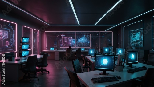 Futuristic office interior with neon lights and computer monitors.