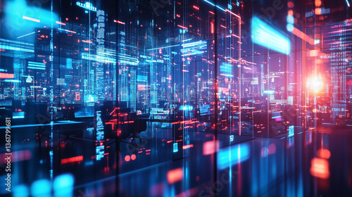 Futuristic office space illuminated with neon lights and digital data displays on glass walls