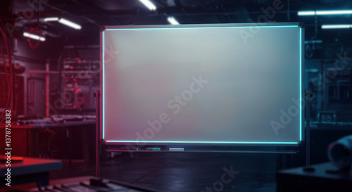 Futuristic office whiteboard in neon lit workspace for high-tech brainstorming