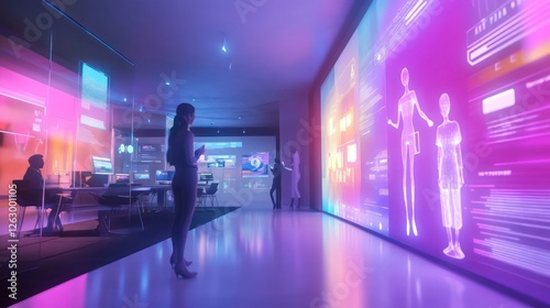 Futuristic office with holographic displays showing data and human figures; woman in business attire observes.