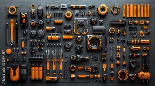 Futuristic Orange Black Tech Gadgets Mechanical Parts and Components Arranged on Dark Surface