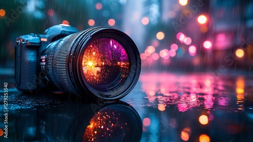 Futuristic photography theme with illuminated bokeh in lens reflection