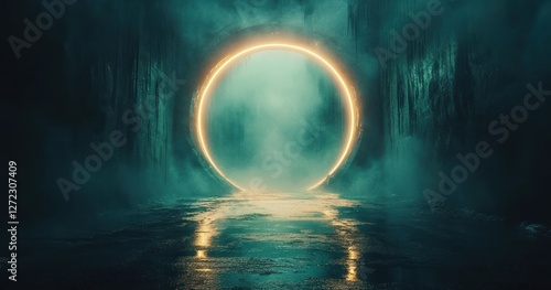 Futuristic Portal Design with Neon Green Light Reflecting on Wet Surface in Cyberpunk Aesthetics