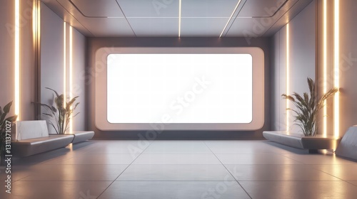 Futuristic Presentation Space: A sleek and modern presentation space featuring minimalist design elements, bright lighting, and an expansive blank screen perfect for showcasing your vision.