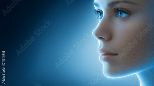 Futuristic profile of woman’s face in glowing blue light, symbolizing artificial intelligence, innovation, and digital future with sleek modern atmosphere.