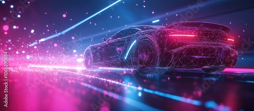 Futuristic rally car in motion with neon fast lines and particles. Technological concept of high speed and energy