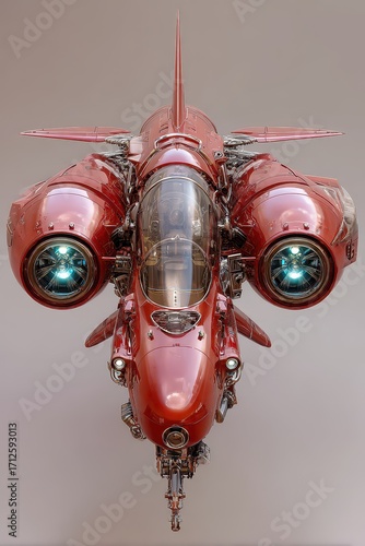 Futuristic red sci-fi aircraft with glowing twin engines and intricate mechanical details.