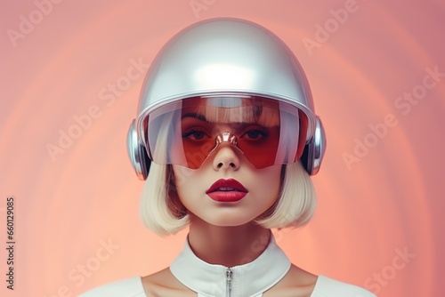 Futuristic retro portrait of a cute blonde girl with painted lips wearing a surrealistic helmet.