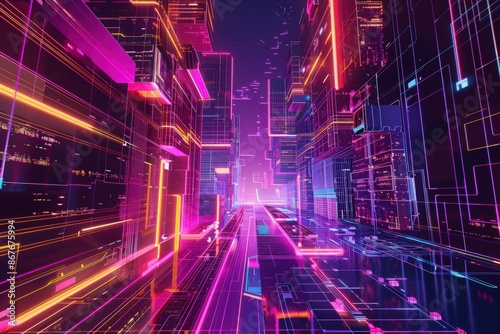 Futuristic retro sci-fi grid with vibrant 80's and 90's neon colors, blending night and sunset palettes, featuring a nostalgic cyberpunk illustration in the retro synthwave style, depicting a neon-lit