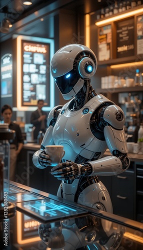 Futuristic robot barista serving coffee in a sleek urban café during the busy morning rush