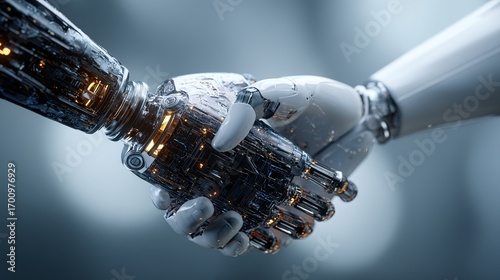 Futuristic robot handshake symbolizing advanced AI collaboration and innovation in a modern technological partnership