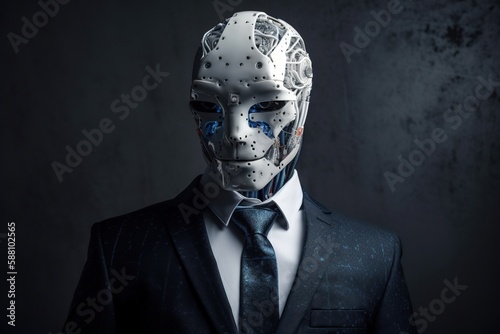 Futuristic robot head wearing business suit with tie, isolated on studio background. Concept of cyborg. Generative AI