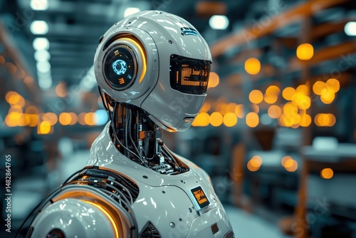 Futuristic Robot in High-Tech Factory with Glowing Orange Lights and Advanced Technology