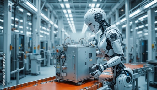 Futuristic Robot Inspecting Industrial Component on Assembly Line