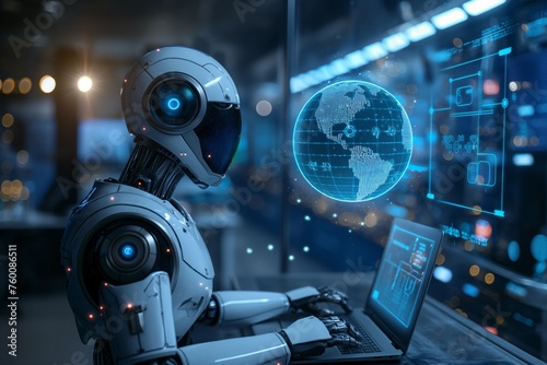Futuristic robot using interface with global network hologram, Concept of AI technology and global connectivity