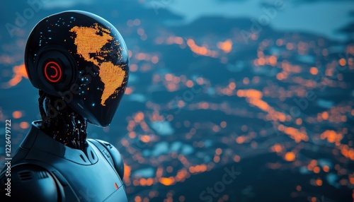 Futuristic Robot with Digital Globe Head Over City Lights at Night