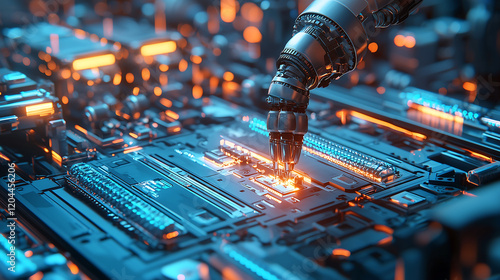 Futuristic Robotic Arm Assembling Advanced Circuit Board Technology