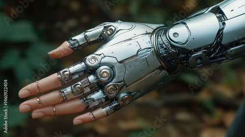 Futuristic robotic arm hand in nature. Complex metallic limb with intricate details, mimicking human hand