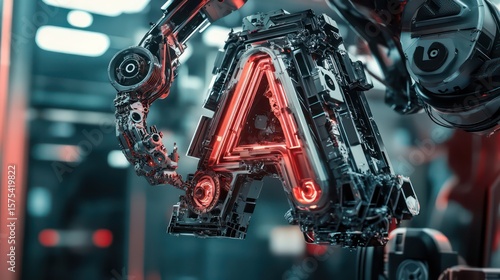Futuristic Robotic Arm Holding Illuminated Letter A with Glowing Red Details