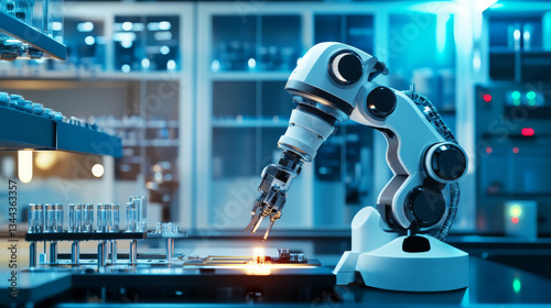 futuristic robotic arm operates in high tech laboratory, showcasing advanced technology and precision. scene is illuminated with blue lighting, emphasizing sleek design and functionality of robot