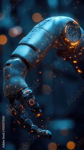 Futuristic robotic arm with glowing circuits in a dark environment