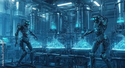 Futuristic Robots in a High-Tech Laboratory: Advanced Robotics and Scientific Discovery in a Cyan-Lit Environment
