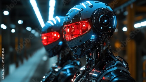 Futuristic robots with red eyes in a high-tech industrial setting