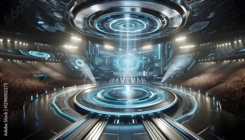 futuristic round stage with sleek metallic surfaces, bright neon lighting, advanced holographic displays