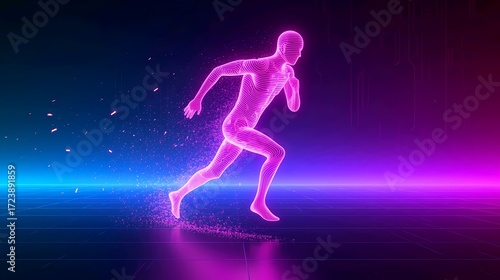 Futuristic runner speeding forward in neon glow, embodying energy and motion for sports technology and cutting-edge fitness campaigns