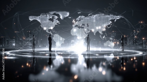Futuristic scene with silhouettes against a glowing world map, representing global connectivity and digital innovation.