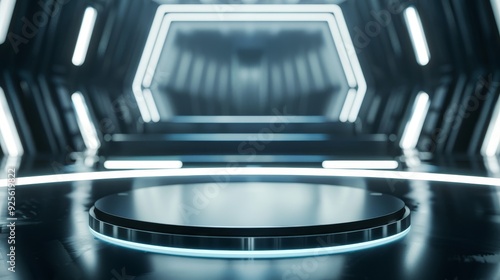 Futuristic sci-fi interior with illuminated hexagonal tunnel and circular platform, ideal for advanced technology and modern design concepts.