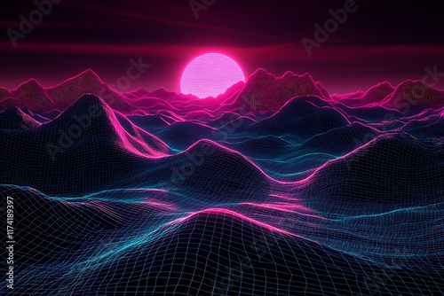 Futuristic Sci-Fi Landscape with Neon-Pink and Blue Digital Grid Sunrise : Generative AI