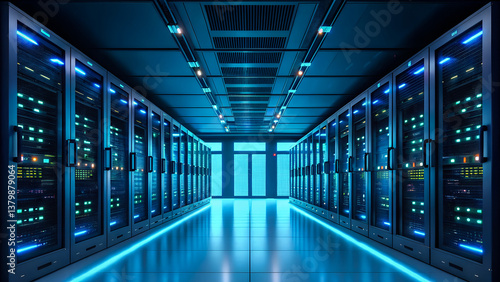 Futuristic Server Room – Data Center with Blue Lighting & High-Tech Infrastructure