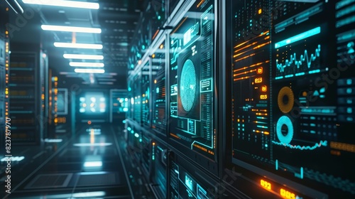 Futuristic server room with advanced technology, digital screens, and data analytics. High-tech environment in a data center.