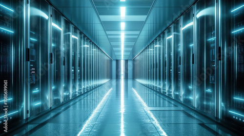 futuristic server room with glowing blue lights and sleek design, showcasing rows of high tech servers. atmosphere is modern and advanced, emphasizing technology and innovation