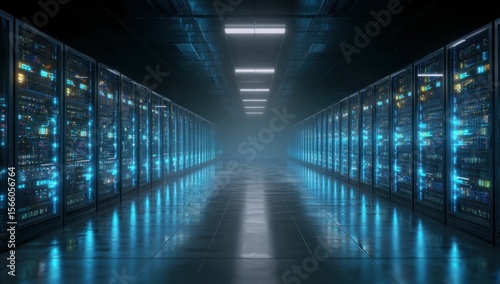 Futuristic server room with glowing data center racks reflects in polished floor.