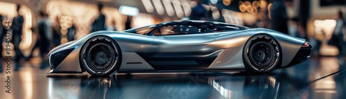 Futuristic silver sports car on display in a modern showroom, showcasing sleek design and advanced automotive engineering.