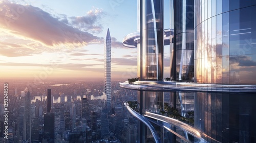 Futuristic skyline featuring modern skyscrapers and elevated platforms at sunset