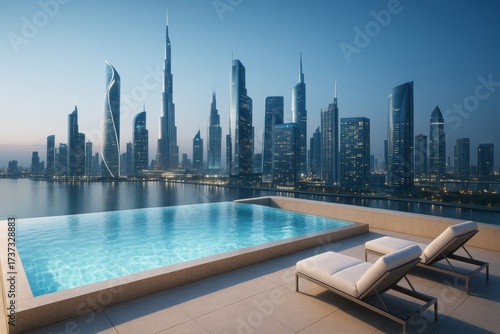 Futuristic skyline of modern skyscrapers at dusk seen from luxury rooftop pool with lounge chairs overlooking water in illuminated cityscape concept. Ai generative