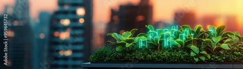 futuristic smart city skyline with green plants and blurred cityscape at sunset.