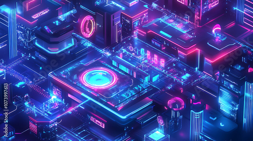 Futuristic smart city with digital technology elements and holographic interfaces concept illustration