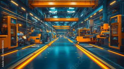 Futuristic Smart Factory Interior with Advanced Automation Machinery in Industry 4.0 Setup, High-Tech Manufacturing Facility, Robotics, and Industrial Innovation, Modern Technology Production at Night