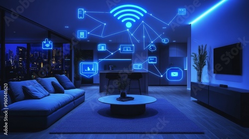 Futuristic smart home interior showcasing glowing WiFi connections in a modern minimalistic design