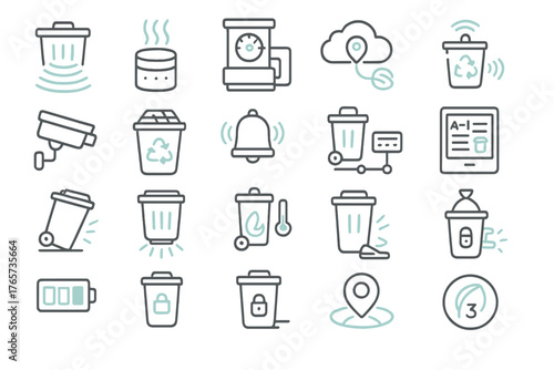 Futuristic smart trash bin and AI waste system icons