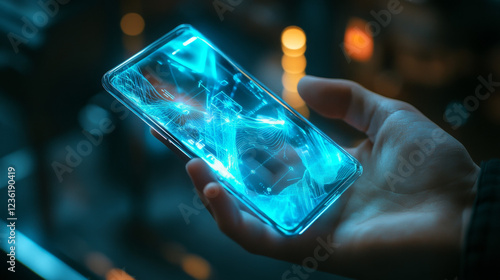 Futuristic Smartphone Interface Hand Holding Mobile with Neon Blue Hologram Data Visualization