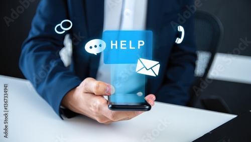 Futuristic Smartphone with Help Hologram and Icons in Future Dust Tones for UI/UX Design, Selective focus