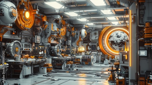 Futuristic Space Station Interior with Advanced Technology and Earth View Through Circular Window
