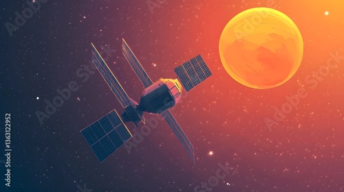 Futuristic spacecraft exploring distant planets, sleek design with solar panels, vibrant colors highlighting cosmic adventure.