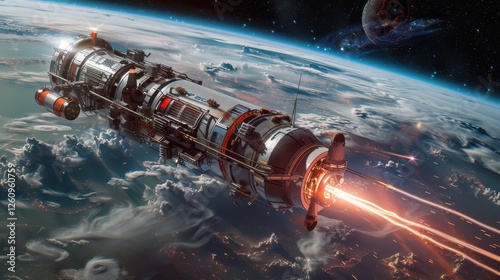 Futuristic Spacecraft in Orbit Above Earth with Advanced Technology and Thrusters Emitting Bright Energy Beams in a Stunning Cosmic Landscape